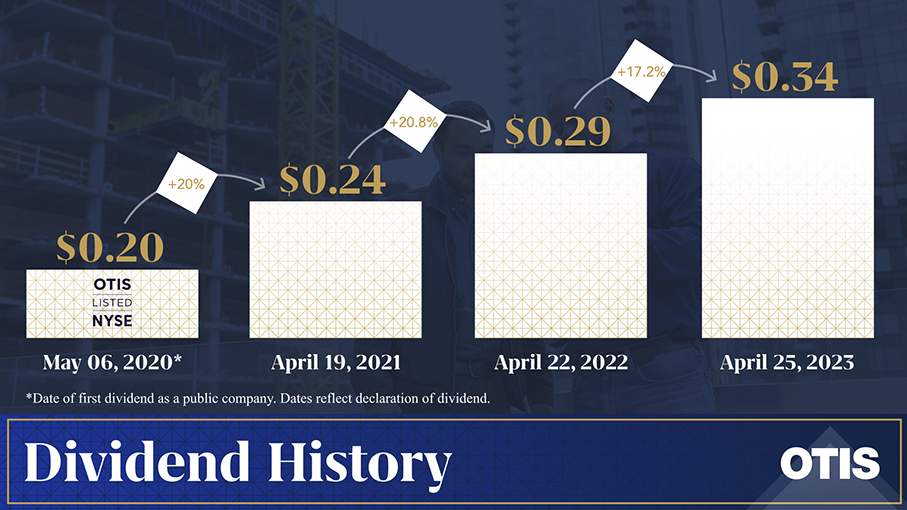 The Otis Worldwide Corporation (NYSE: OTIS) Board of Directors today declared a quarterly dividend of $0.34 per share of Otis’ common stock, which represents a 17.2% increase. The dividend will be payable on June 9, 2023, to shareholders of record at the close of business on May 19, 2023. “With confidence in our Service-driven strategy, which drives consistent cash flow generation, we are pleased to announce this increase in our dividend,” said Judy Marks, Otis Chair, CEO and President. “This progress is a direct reflection of the importance we place on disciplined capital allocation and our commitments to Otis stakeholders.”